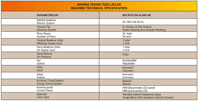 Yıkama Makinesinde su ile şişelere içten ve dıştan güvenilir yıkama yapılabilir. İstenilen yıkama suyunun önüne uygun bir filtre takılarak aseptik yıkama sağlanabilir. Soğuk veya Sıcak hava ile kurutma özelliğine sahiptir. Makinenin hava ve suyla temas eden bütün yüzeyleri 304kalite paslanmaz çelikten imal edilmiştir. Yıkama ünitesi flexi glass kabinle kaplanmış olup makine dışarısına sıvı ve dışarıdan yabancı madde tahliyesi engellenmiştir. Kurutma tüneli ile yıkama ünitesinden gelen şişe üzerindeki ıslaklık giderilerek tam bir kurutma sağlanır. Makine az yer kaplaması, ayar ve çalışma kolaylığı sayesinde kısa sürede format değiştirebilir. Kozmetik sektöründe kullanılabilir şekilde tasarlanmıştır